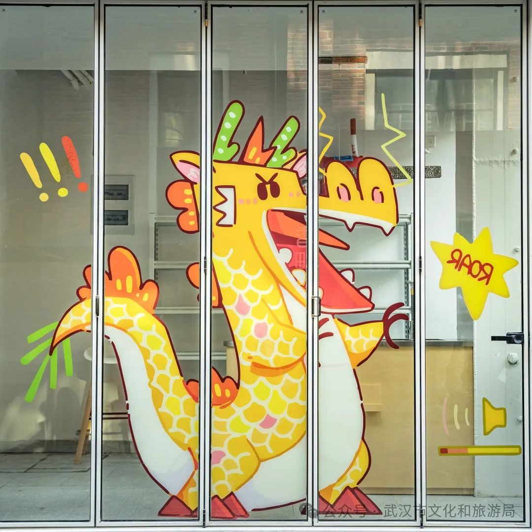 漫游到「武汉天地」,一侧是乔乔兔的公共展览,另一侧的玻璃墙已换上龙年皮肤。