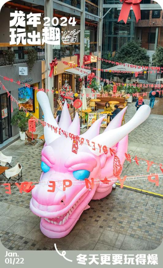 青岛路的「平和打包厂」外,盘了一条粉色龙,很时尚;夜晚喝酒胜地「一元路」,长长的气模龙像从墙里钻出来,笑眯眯的龙爷爷,跟每个过路人说新年好。