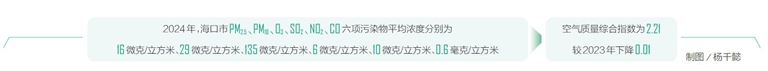 2024年,海口市PM2.5、PM10、O3、SO2、NO2、CO六项污染物平均浓度分别为:16微克/立方米、29微克/立方米、135微克/立方米、6微克/立方米、10微克/立方米、0.6毫克/立方米。