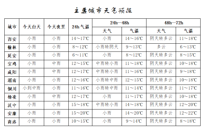 10月31日:全省阴天有小雨(1~10毫米),其中陕北南部局地、关中大部、陕南西部部分地方有中雨(10~25毫米)。日平均气温陕北北部、陕南东部下降4℃左右。