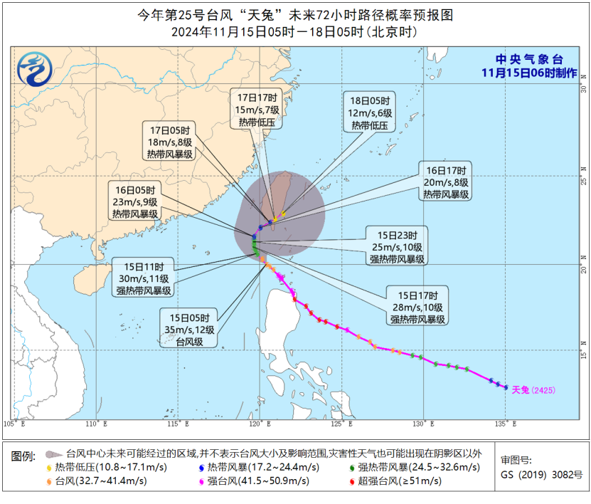 预计,11月15日08时至16日08时,内蒙古大部、西藏北部和西部、青海南部、宁夏北部、陕西北部、台湾岛南部等地有5~6级、阵风7~8级的大风,其中台湾岛南部部分地区有7~8级、阵风9~10级的大风。渤海、台湾海峡和台湾以东洋面的南部海域、南海东北部海域、巴士海峡将有7~8级、阵风9~10级的大风,其中巴士海峡和南海东北部部分海域风力可达9~10级、阵风11~12级,台风“天兔”中心经过的附近海域风力可达11~12级、阵风13~14级。中央气象台11月15日06时继续发布大风蓝色预警。