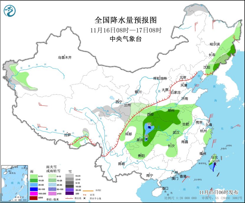 11月16日08时至17日08时,黑龙江西北部、吉林东部、新疆南疆西部山区、西藏东南部、青海东部、甘肃南部、宁夏南部、陕西西部等地部分地区有小到中雪或雨夹雪。吉林东部、陕西东南部、河南中南部、湖北中西部、四川盆地东部、重庆北部和东部、台湾岛东部和南部等地部分地区有中到大雨,其中,重庆东北部、台湾岛东南部等地部分地区有暴雨或大暴雨(100~120毫米)。内蒙古东部、东北大部、山东半岛、西藏北部和南部、青海南部等地部分地区有4~6级风(见图3)。