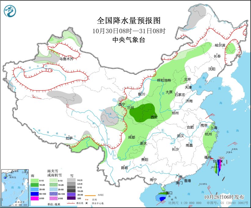 10月30日08时至31日08时,内蒙古东北部和中部、新疆北疆北部和沿天山一带、青海东部和西南部、川西高原北部等地部分地区有小雪或雨夹雪。西北地区东部、海南岛、台湾岛大部等地部分地区有中到大雨,其中,海南岛东南部、台湾岛东部等地部分地区有暴雨或大暴雨(100~200毫米)。西藏西部、青海西部等地部分地区有4~6级风(见图4)。