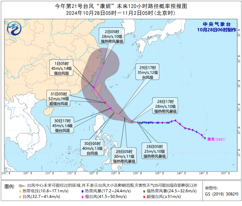 图1 今年第21号台风“康妮”未来120小时路径概率预报图(10月28日05时-11月2日05时)