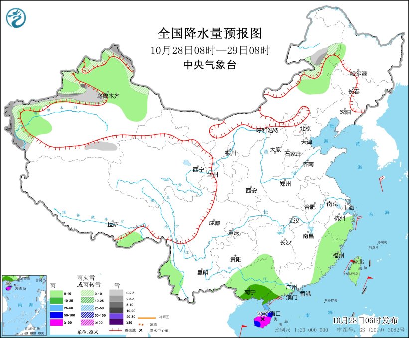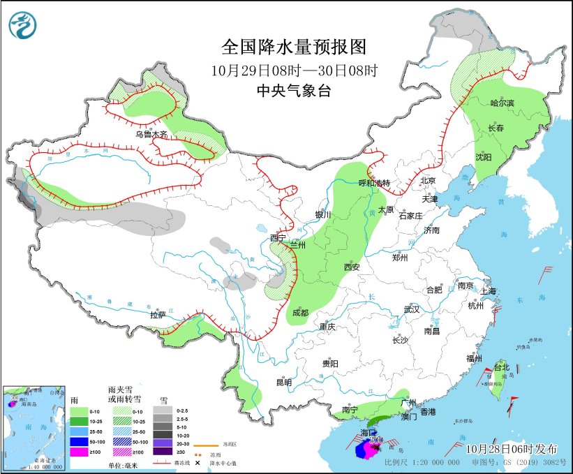 10月28日08时至29日08时,内蒙古东北部、新疆北部和西南部等地部分地区有小雪(雨)或雨夹雪,其中,新疆北疆北部和南疆西部山区等地部分地区有中到大雪。华南南部等地部分地区有中到大雨,其中,海南岛等地部分地区有暴雨或大暴雨(100~200毫米)(见图2)。