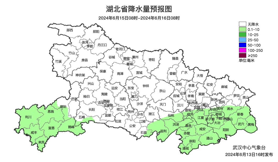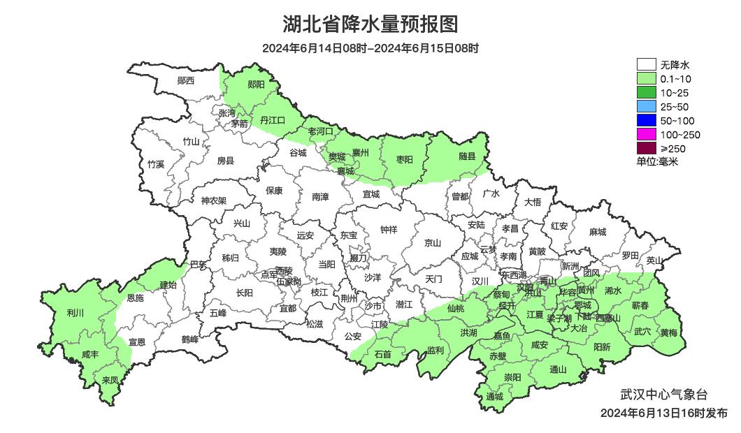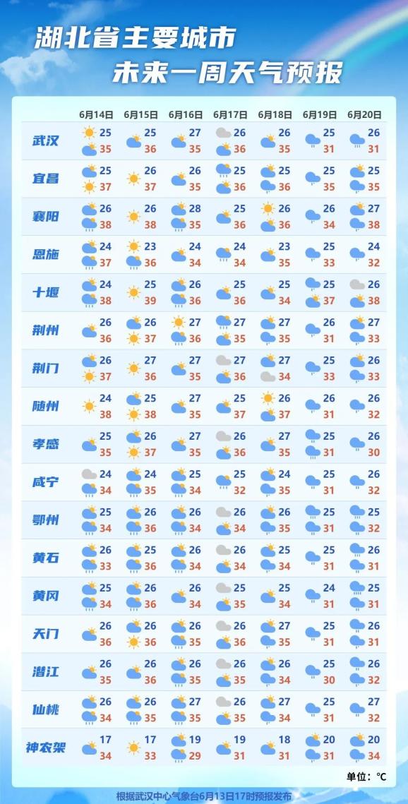 6月14日08时-15日08时,全省多云,其中鄂西北、鄂西南、江汉平原南部、鄂东南有分散性阵雨或雷阵雨,局地有雷暴大风等强对流天气。最高气温鄂东南31~34℃、其他地区34~38℃,最低气温22~26℃,偏南风2到3级。