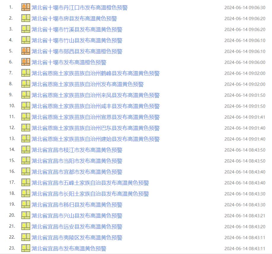 十堰市气象台2024年06月14日09时05分发布高温橙色预警信号:预计今天14至17时,十堰北部最高气温将达37℃以上,南部35℃以上,请注意防范。