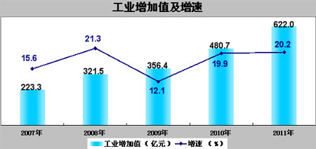 全年实现工业增加值622亿元,比上年增长20.2%。其中规模以上工业增加值548.7亿元,增长22.1%。规模以上工业总产值1759.8亿元,同比增长32.7%。