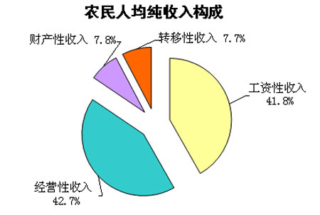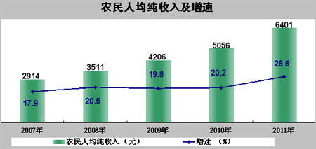全年农村居民人均纯收入6401元,比上年名义增长26.6%,扣除价格因素,实际增长19.5%。其中,工资性收入2674元,比上年名义增长41.1%;家庭经营收入2734元,增长13.6%;财产性收入503元,增长26.7%;转移性收入490元,增长37.2%。农村居民人均生活消费支出4701元,比上年增加834元,增长21.6%。全年城乡居民收入比为3.47:1(以农村居民人均纯收入为1),比上年降低0.27个百分点。