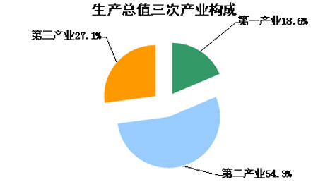 初步核算,全年生产总值1359.1亿元,比上年增长14.2%。其中,第一产业增加值252.5亿元,增长7.2%,占生产总值的比重为18.6%;第二产业增加值738.1亿元,增长19.6%,占生产总值的比重为54.3%;第三产业增加值368.5亿元,增长9.1%,占生产总值的比重为27.1%。人均生产总值27705元,约合4289美元。