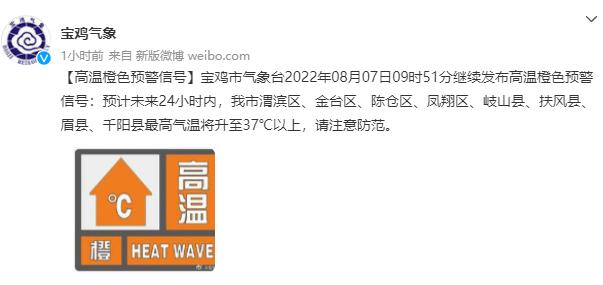 今天上午9时51分,宝鸡市气象台继续发布高温橙色预警信号:预计未来24小时内,我市渭滨区、金台区、陈仓区、凤翔区、岐山县、扶风县、眉县、千阳县最高气温将升至37℃以上,请注意防范。