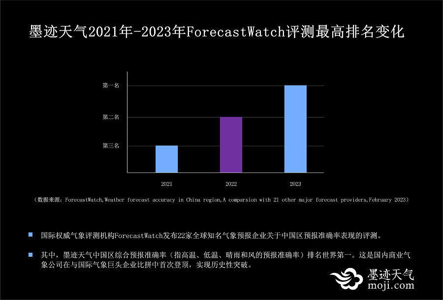 近日,国际权威气象服务评测机构ForecastWatch最新评测结果显示,墨迹天气在中国区1-3天综合预报准确率(高温、低温、晴雨、风速)排名第一,同时高温、风速单项预测准确率方面排名第一。ForecastWatch是全球首屈一指的天气预报监测和评估公司,通过国家气象局等渠道收集来自世界数千个地点的天气预报数据来评估和比较天气预报供应商的预报结果,帮助政府和企业通过预测精度分析来作出对于营收、运营和风险降低的决策。