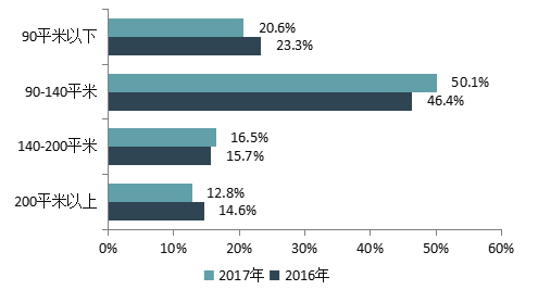 图8 前50企业2016、2017年重点项目各面积段销售占比