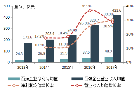 图17 百强企业2013-2017年营业收入与净利润均值变化情况