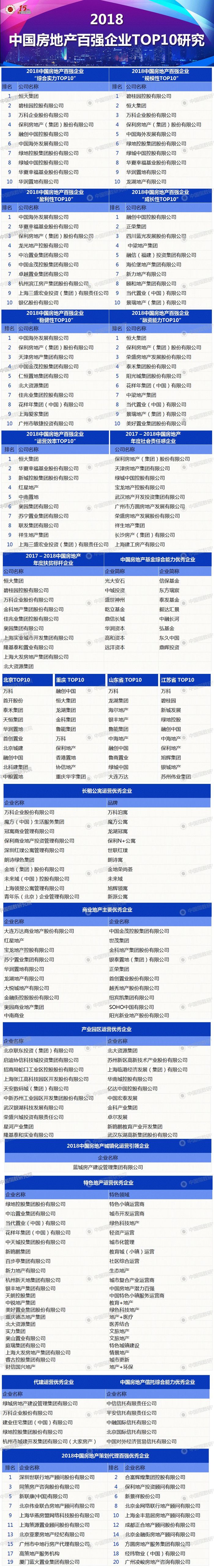 中国房地产TOP10研究组在百强企业研究的基础上,对企业规模性、盈利性、成长性等方面进行了深入研究,评价产生了2018中国房地产百强TOP10企业。此外,随着中国房地产市场进入高质量发展的新时代,房地产服务也迎来提质变革的新阶段。在此背景下,中国房地产TOP10研究组对特色地产企业、策划代理企业及金融服务企业进行深入地分析研究,评选出了在长租公寓、商业地产、产业园区、城镇化运营、特色地产、代建运营、策划代理、房地产基金、房地产信托等领域的优秀企业。