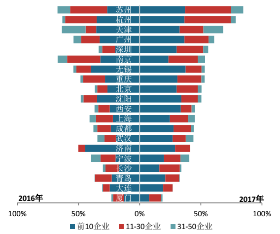 2017年,部分热点城市受到严格的政策调控,但百强企业凭借强大的综合实力抢抓市场机遇,实现销售业绩快速增长,城市集中度继续保持高位。具体来看,百强前50企业在广州、深圳、杭州、天津、苏州等热点城市的销售集中度均超50%,其中杭州、苏州更是超70%;在深圳、苏州、杭州、北京等城市销售集中度提升明显,分别提高14.0、22.5、15.2、17.5个百分点。分层级来看,热点城市中规模较大的百强企业优势更为凸显,前10企业、11-30企业在深圳、杭州、苏州、南京的销售集中度均超20%。