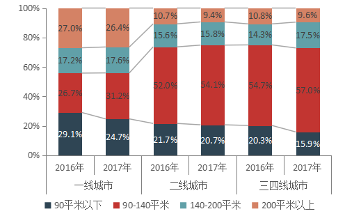 图9 前50企业2016、2017年分城市等级各面积段销售占比