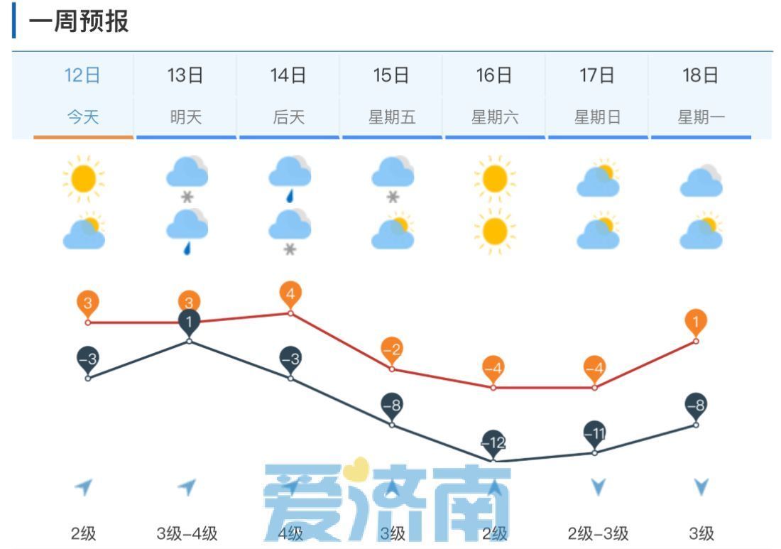 预计,明天白天济南阴有小雪,降水概率70%,明晨最低气温-6~-3℃左右,明天最高气温3℃左右。明天夜间到14日白天有雨或雨夹雪转小雪,14日夜间有大雪,降水概率80%,东北风3~4级逐渐增强到4~5级阵风7级,最低气温0℃左右,最高气温2℃左右。