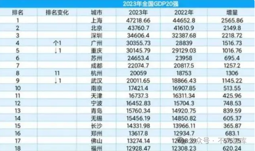根据各城市统计局发布的数据,全国GDP前20强的排名依次为:上海、北京、深圳、广州、重庆、苏州、成都、杭州、武汉、南京、天津、宁波、青岛、无锡、长沙、郑州、佛山、福州、济南和合肥。与去年相比,有4座城市排名发生了变化。