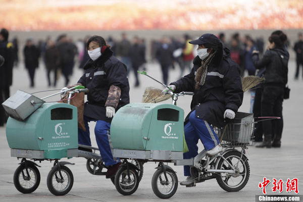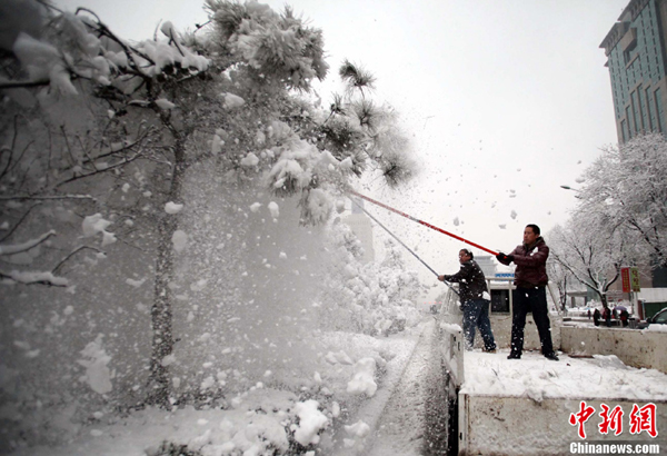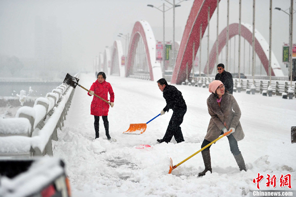 11月29日下午,太原全市已出动15.49万人次,对城市街道、桥梁的积雪进行清理。中新社发 张云 摄