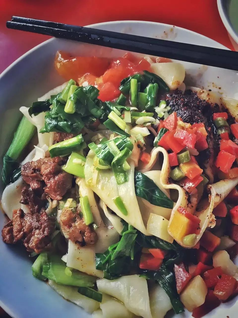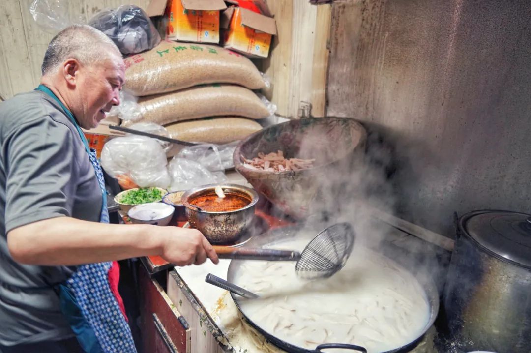 宽面白亮而劲道,用料则极为扎实:臊子味浓,辣子喷香,红萝卜豆腐青菜,将味觉调和,一口下去,厚重而酸香。