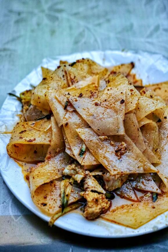 口感独特的西府醋粉之外,有小麦面+荞面做成的复古黑面皮;大火蒸制,口感绵软的蒸面皮;柔火烙烤,风味独特烙面皮;加上喷香的肉汁腊肉的面皮PLUS——烧肉面皮;时间紧张,可用面糊即摊即蒸,变成“懒面皮”。但宝鸡人最爱的,还是发源自岐山的擀面皮。