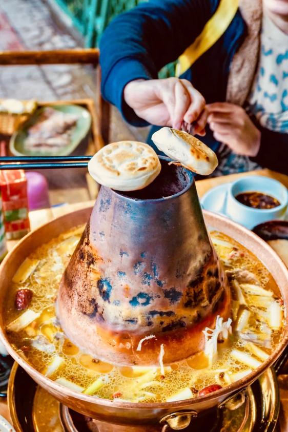 铜锅烧开,先不涮肉,而是烤热饼子,还有点烫手的油辣子端上来,滋滋地冒着热气,先趁势来一个油泼辣子夹馍,再调一点辣子油碗。肉片烫好,在辣子里翻滚片刻,穿上一层红通通、油亮亮的火热外套,看似卖相火热红亮,豪放动人,一入口,却是满满鲜香。