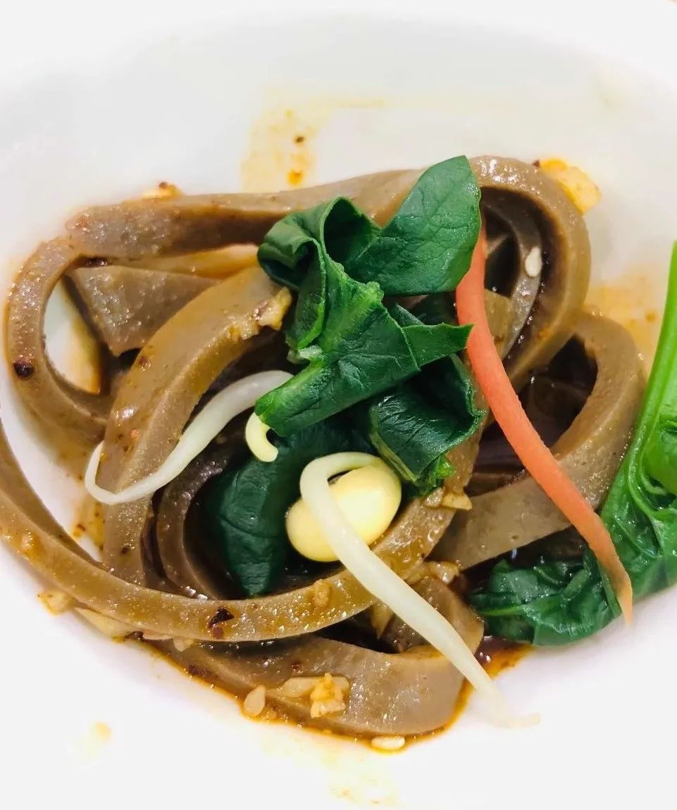切成条的西府醋粉,又黑又亮,佐以油泼蒜泥,配以豆芽菠菜、食盐、油辣子,入口一点微酸,又特有新醋的酱香与醇香,再搭配玉米糁子汤,实在是可酸可甜,令人精神一振。