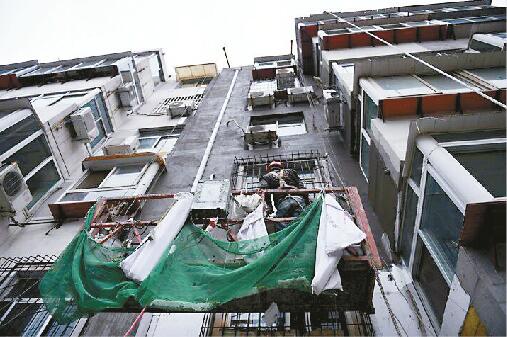 17日,在历城区的花园小区,住宅楼外墙正在贴装保温层。新时报首席记者王锋 摄