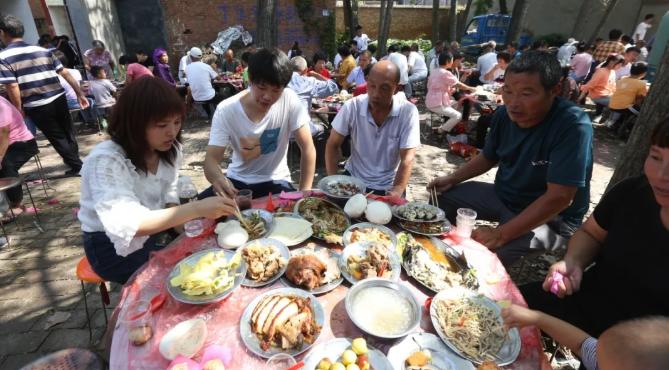 6)10月1日,周口小伙王彭彭大婚,办了热闹的农村流水席。每桌30多道菜的流水席只要300多块钱,除了常见的花生米、豆腐皮、拌牛肉等,还有红烧醋鱼、清蒸鲟鱼、酱焖肘子等“硬菜”,可谓既节俭又丰盛。