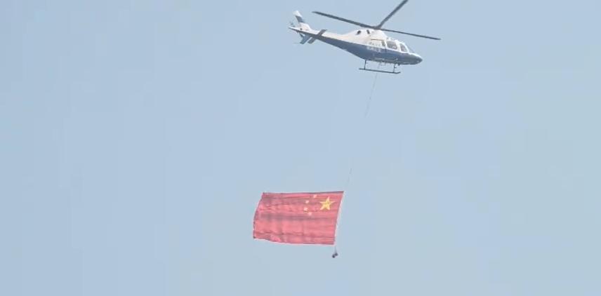 5)10月1日上午10时,郑州市公安局警用直升机悬挂巨幅国旗出现在郑州城市上空,五星红旗迎风飘扬,飞过郑州东站,掠过大玉米,飞向二七广场……无数群众目睹了国旗从城市上空飞过,欢呼雀跃。