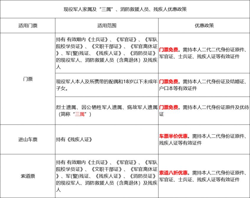 对现役军人(持军官证(离退休证)、士官证、士兵证等有效证件)、残疾人(持残疾证)、消防救援人员(持消防员证(离退休证))实行索道八折优惠,具体见正文。