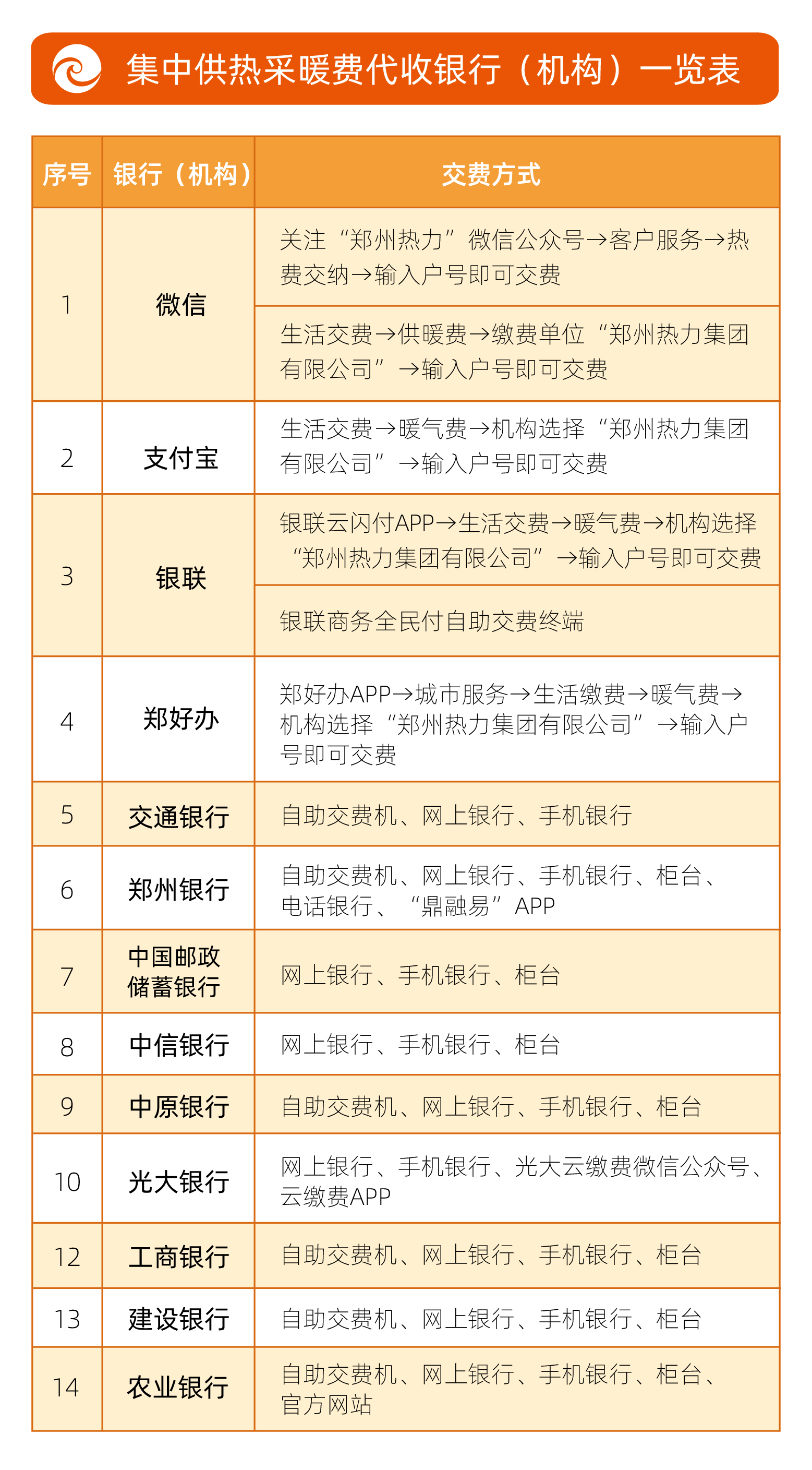 此外,热费代收机构也开启收费模式,用户可持城市集中供热用户交费卡到交通银行、中信银行、郑州银行、中国邮政储蓄银行、工商银行、中原银行、光大银行、建设银行、农业银行等9家银行代收机构交费。