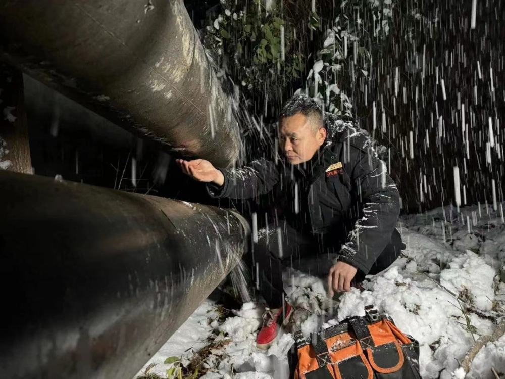 郑州热力的工作人员冒雪对架空管网进行巡检。(郑州市城市管理局供图)