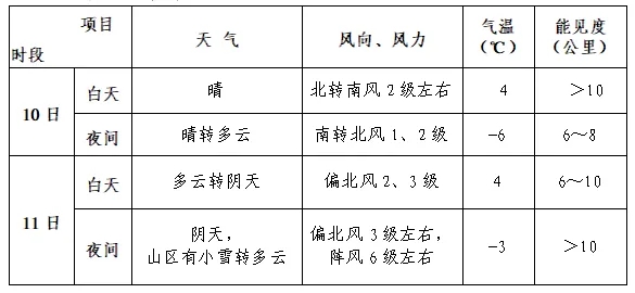 10日北京天气为晴到多云,风力不大;11日云量增多,傍晚至前半夜山区有小雪,能见度略有转差。受冷空气影响,11日夜间偏北风逐渐增大至3级左右,阵风6级左右,能见度转好。期间白天最高气温4℃,夜间最低气温-6~-3℃。具体预报见附表: