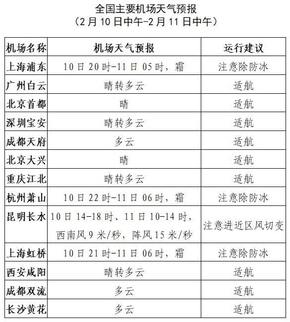 10日中午至11日中午,内蒙古、山西北部、河北、北京、天津、山东、辽宁、吉林、黑龙江、云南、贵州、湖南等地的中低空空域有轻度颠簸;新疆西北部、内蒙古东北部、黑龙江、吉林等地的低空空域有积冰条件。