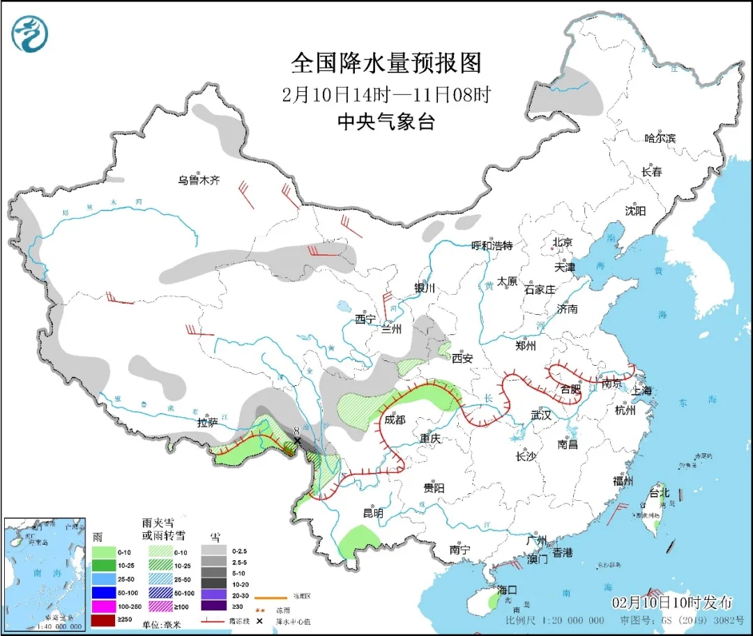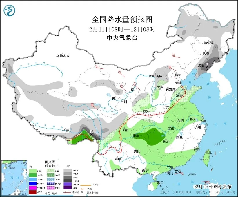 图1 全国降水量预报图(2月10日14时-11日08时)