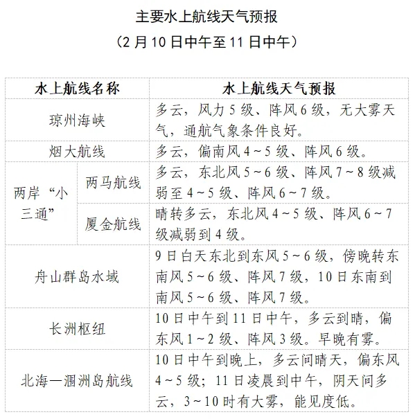 10日中午到11日中午,琼州海峡多云,风力5级、阵风6级,无大雾天气,通航气象条件良好。