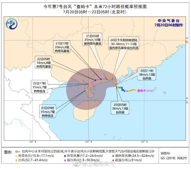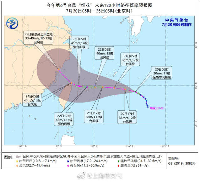 根据气象部门预测,第6号台风“烟花”将以每小时10-15公里的速度向偏西方向移动,强度逐渐加强,最强可达台风级或强台风级(13-15级,40-48米/秒),7月21日夜间或22日凌晨移入东海海面,可能擦过台湾岛北部,然后逐渐向浙闽沿海靠近,并于7月25日凌晨到上午在浙闽沿海登陆(台风级,12-13级,33-40米/秒)。