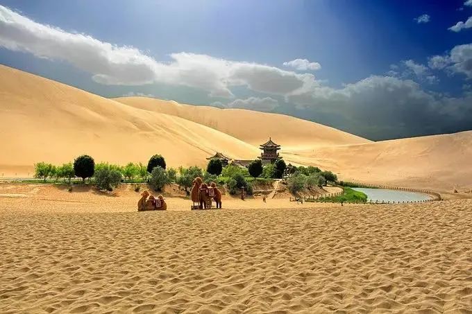 鸣沙山地处甘肃省敦煌市郊,巴丹吉林沙漠和塔克拉玛干沙漠的过渡地带。从山顶下滑,脚下的沙子会呜呜作响;白天人们爬沙山留下的脚印,第二天竟会痕迹全无。鸣沙山,沙峰起伏,金光灿灿,宛如一座金山。月牙泉被鸣沙山环抱,因水面酷似一弯新月而得名,在四面黄沙的包围中,泉水清澈明丽,且千年不涸,令人称奇。