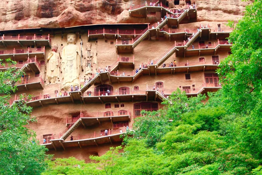 麦积山石窟是闻名世界的艺术宝库。麦积山洞窟大都开凿在悬崖峭壁之上,洞窟之间全靠架设在崖面上的凌空栈道通达。在悬崖峭壁上开凿成百上千的洞窟和佛像,难度之大,智慧之高,这在我国的石窟中是非常罕见的。这里荟萃着十六国至元、明、清等十多个朝代的塑像7200余尊,壁画1300多平方米。麦积山是“我国历代的一个大雕塑馆。”