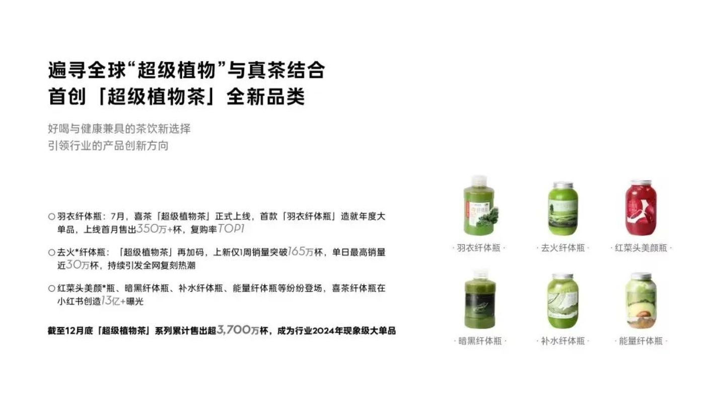 「超级植物茶」系列便是喜茶打造大单品的重要尝试,今年1月20日,喜茶又在2025春节前夕全国上线「超级植物茶」系列新年新品“去油纤体瓶”,去油纤体瓶和羽衣纤体瓶、去火纤体瓶三款系列产品均进入春节销量TOP10。