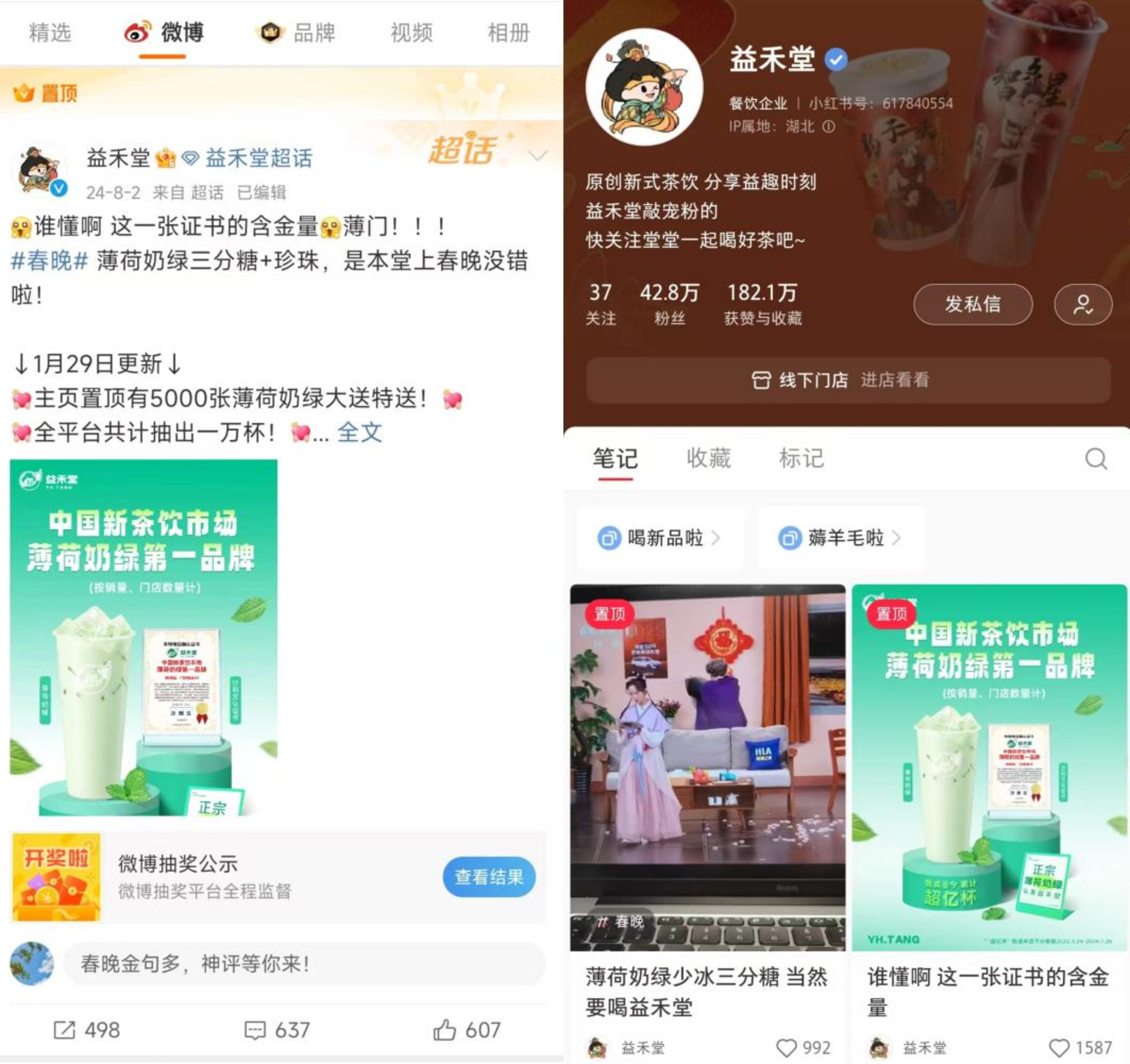 节目播出半小时后,益禾堂迅速“借力打力”,在微博、小红书、抖音三大平台推出 “益禾堂新年送 10000 杯薄荷奶绿” 活动。官微更是巧妙利用 “薄荷奶绿少冰三分糖 + 珍珠” 的春晚同款文案,发起 #益禾堂薄荷奶绿上春晚# 话题互动,快速响应,春晚带货下,全国薄荷奶绿系列销售总杯量超150万杯。