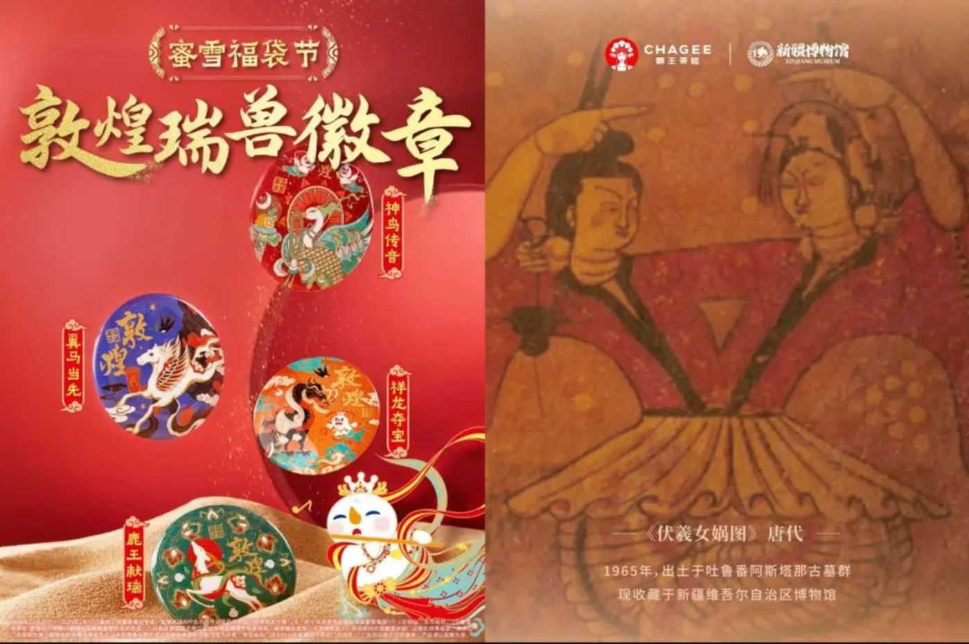 类似的,霸王茶姬携手新疆维吾尔自治区博物馆,推出「霸王茶姬灵蛇启运杯」新春限定包装,以《伏羲女娲图》双蛇相交为灵感,选取伏羲、女娲、日月、星辰、金蟾等元素打造乙巳蛇年新春主题视觉,构建出极具东方神秘色彩的乙巳蛇年新春主题视觉体系。