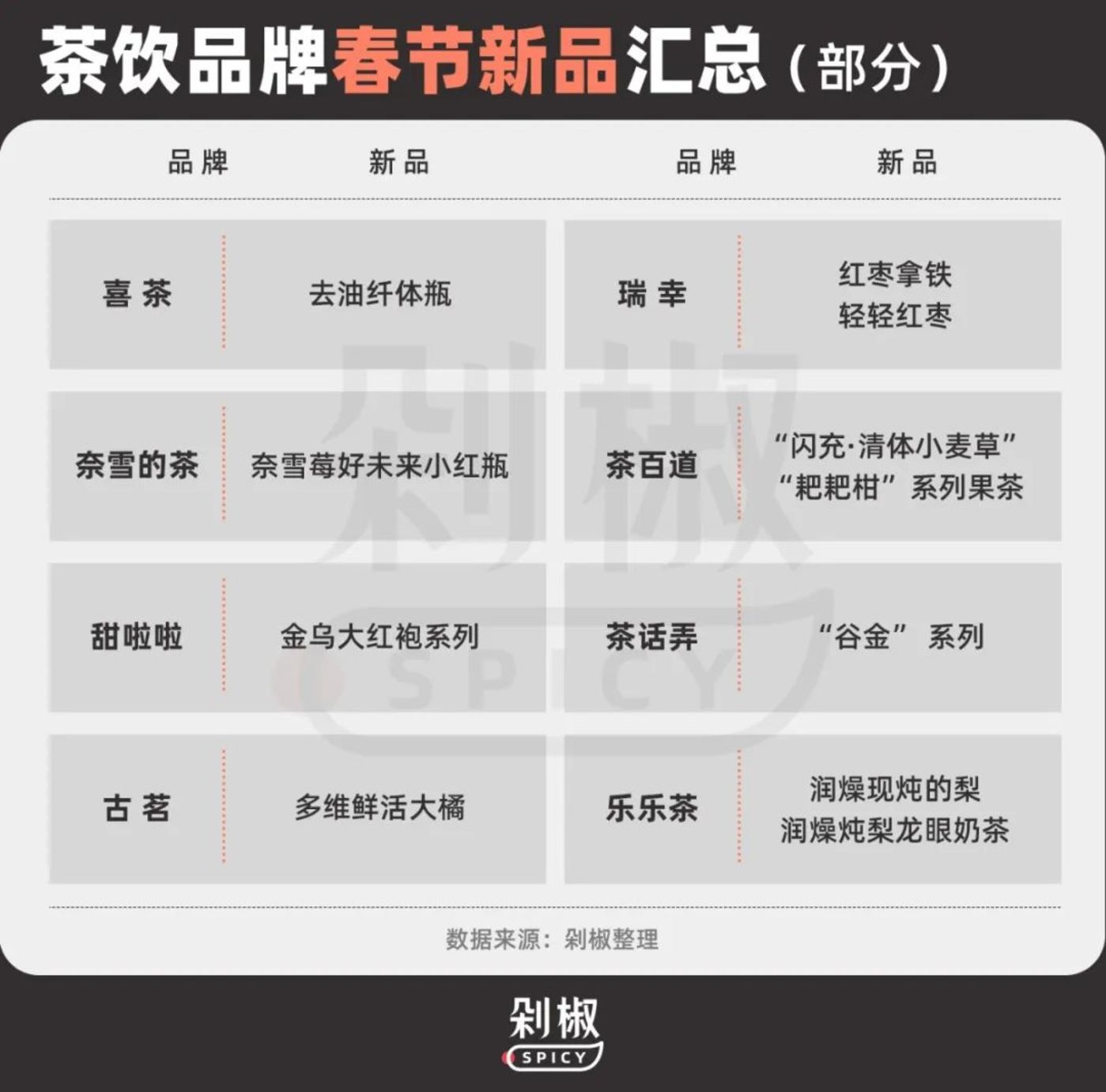 显然,春节档是新茶饮的一场大考,各个品牌都想突围,剁椒 spicy 梳理了春节档新茶饮品牌的动作,并和众多茶饮品牌们聊了聊,探究新茶饮消费市场究竟涌现出了哪些新趋势和新玩法。