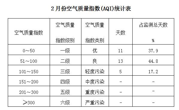 2024年2月滁州市环境空气监测的实际天数为29天,空气质量指数(AQI)的范围在30~149之间,首要污染物主要为PM2.5。根据空气质量指数的量化评价结果显示:2月份,滁州市空气质量达到一级的天数为11天,占监测总天数的37.9%;达到二级的天数为13天,占监测总天数的的44.8%;达到三级的天数为5天,占监测总天数的的17.2%。2月份滁州市环境空气优良率82.8%。