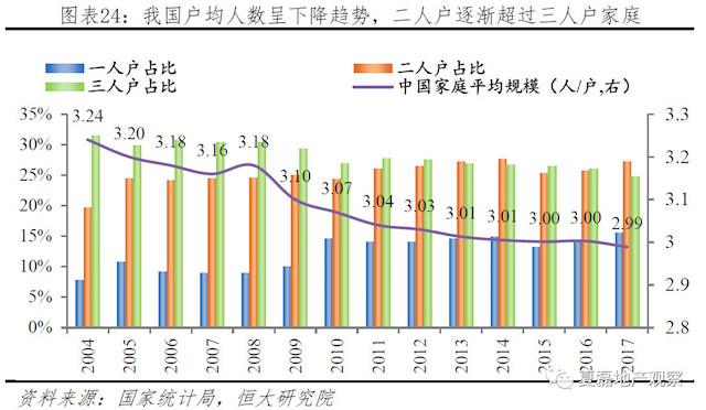 2017年我国家庭户均人数2.99人,1~2人家庭户占比42.8%,分别较2004年减少0.25人、增加15.4个百分点。和德日英韩美均值2.36人、63.6%相比,我国家庭规模有进一步小型化空间。
