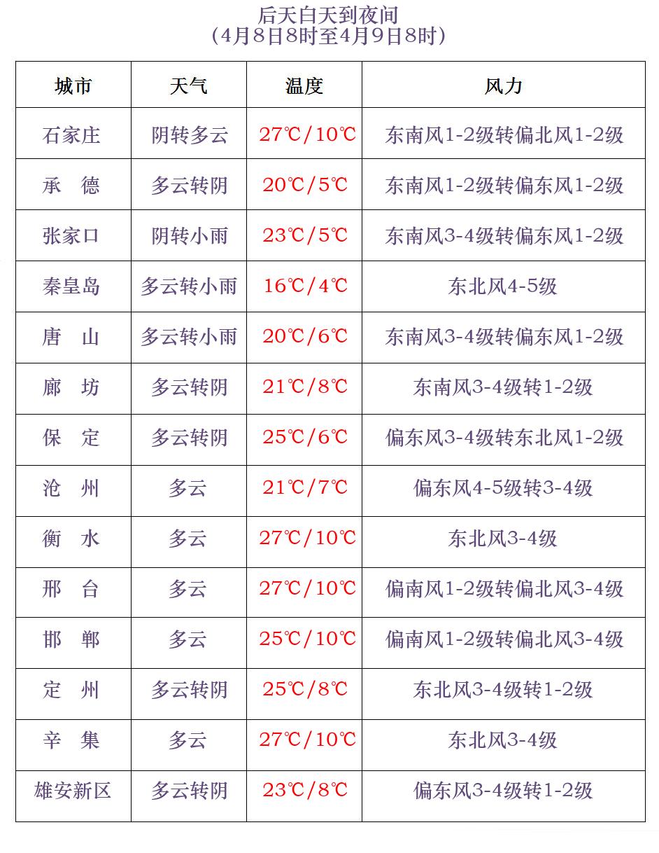 8日夜间到9日,中北部地区多云转阴有阵雨或雷阵雨,其中承德北部有雨夹雪,其他地区多云。渤海海域和沿海地区有东北风5到6级,阵风7级。