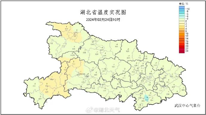 24日08时-25日08时,恩施南部、荆州、仙桃、孝感南部、武汉、鄂州、黄冈、黄石、咸宁有冻雨或冰粒;其他地区零星小雪或冰粒转阴天。最高气温大部地区-1~2℃,最低气温大部地区-3~0℃。偏北风2到3级。