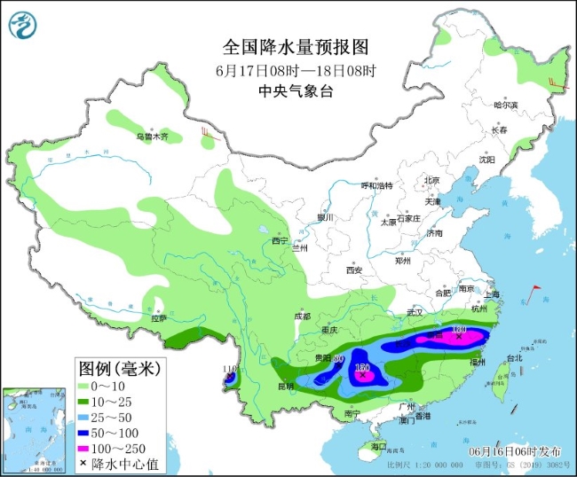 6月17日08时至18日08时,江南中南部、贵州南部、华南北部、云南东部和西部等地部分地区有大到暴雨,其中,江西中部、浙江南部、福建北部、贵州东南部、广西北部等地部分地区有大暴雨(100~180毫米)。黑龙江东北部、新疆东部等地部分地区有4~6级风(见图4)。